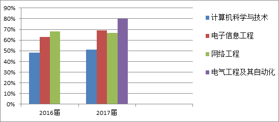 2017届我院毕业生共计282人,截止到2017年5月21日,成功就业人数已达184人,就业率为65.25%,其中工科类专业4种:计算机科学与技术专业39人,就业人数20人,就业率为51.28%;电子信息工程专业共计84人,就业人数58人,就业率为69.05%;网络工程专业共计39人,就业人数26人,就业率为66.67%;电气工程及其自动化专业共计40人,就业人数32人,就业率为80.00%,我院所有工科专业就业率均有提高,其中2013年我院新增专业电气工程及其自动化为我院当前就业率最高的专业。